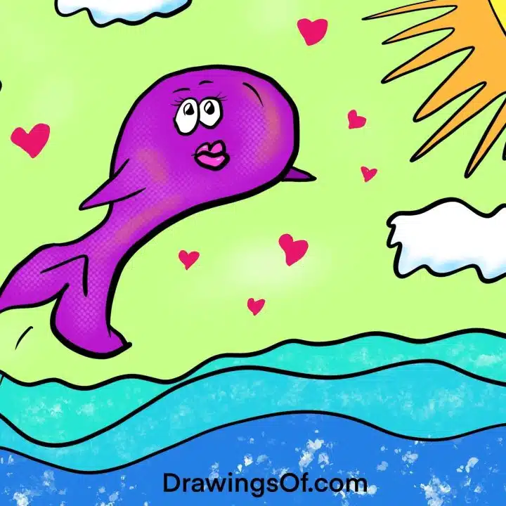 People and animals make highly cute and funny faces when in the middle of jumping, so see if you can sketch a "freeze frame" moment from a leap, as shown in my example here with a purple whale emerging from the ocean. Indicate the movement of the jump with lines.