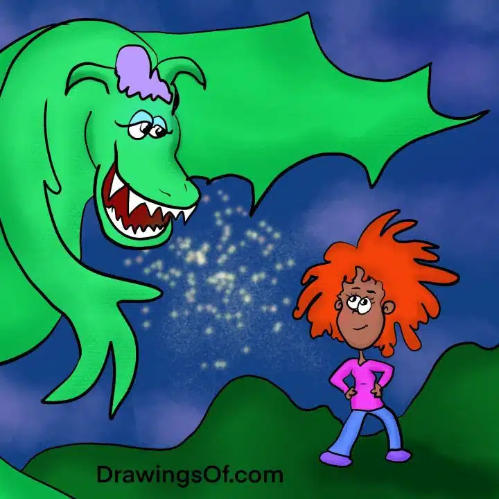 A great trick of creating humor through art is to juxtapose (contrast) a big thing with a tiny one. In my example cartoon here, a small girl is powerfully standing up to a hulking dragon.